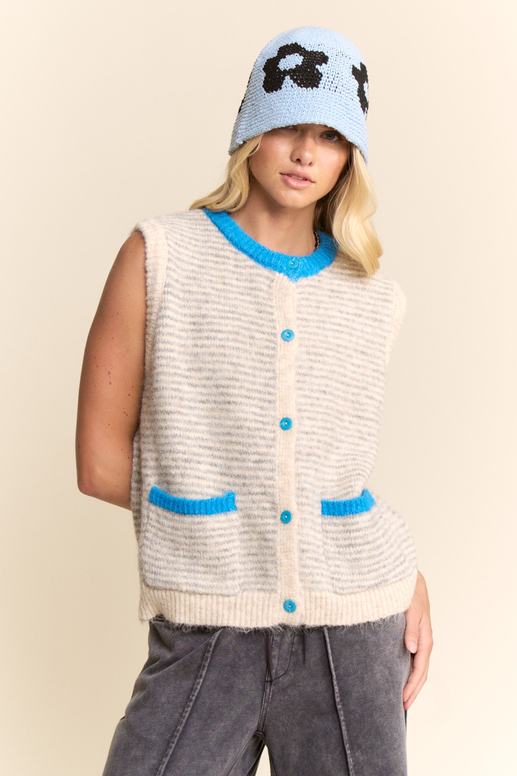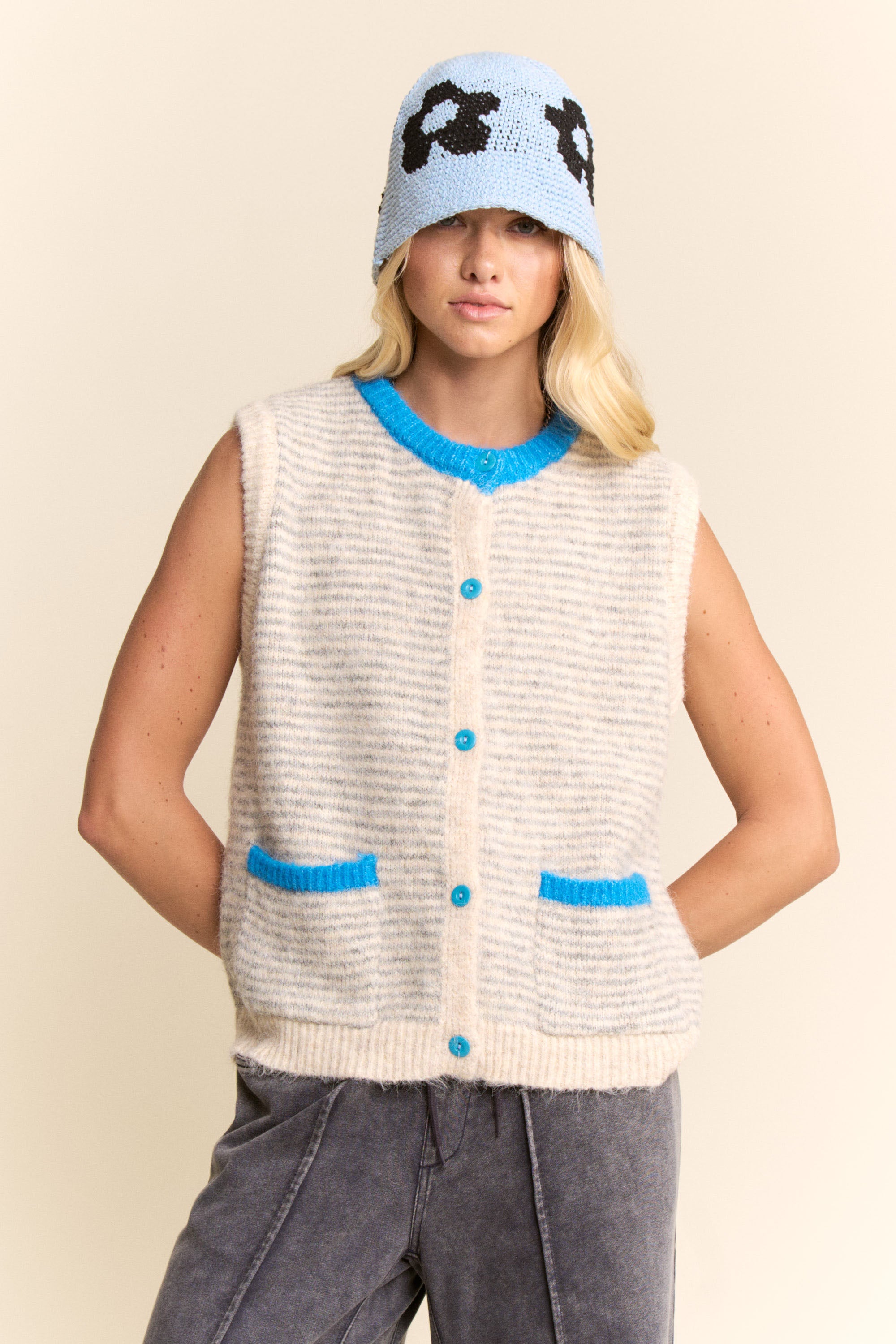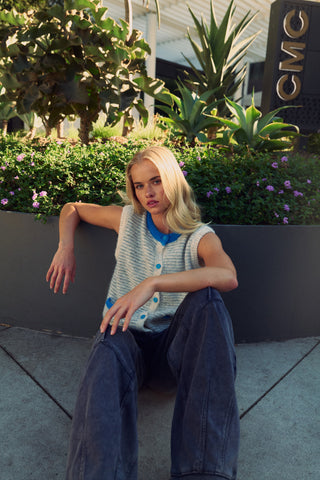 A textural study in softness and sophistication—the Lunel Vest is your new cool-weather companion with a touch of Parisian charm. Crafted in a fuzzy boucle knit with subtle micro stripes, it's detailed with contrast blue trim at the neckline, pockets, and buttons for an unexpected pop.