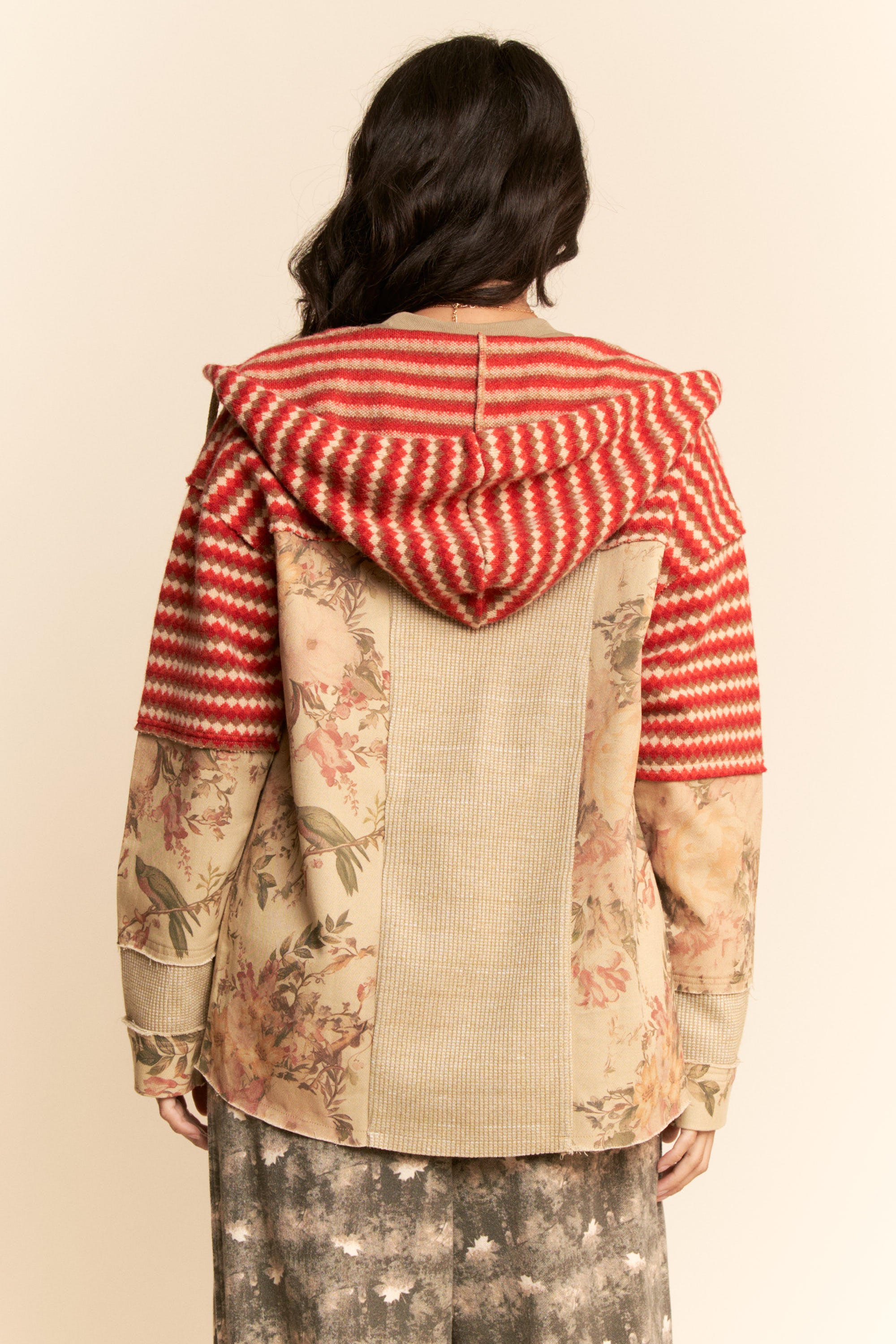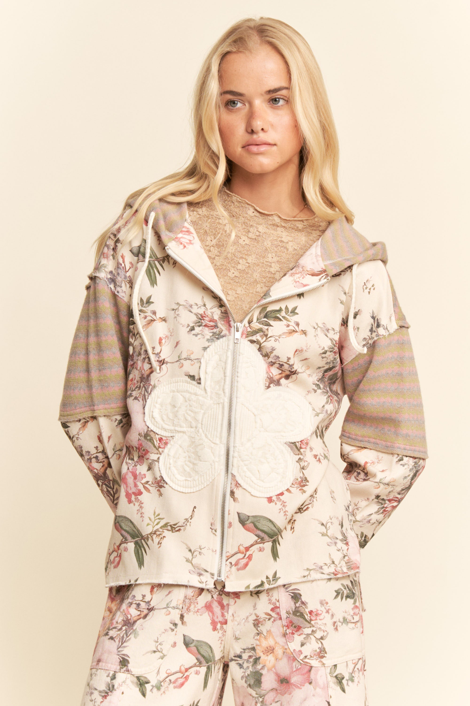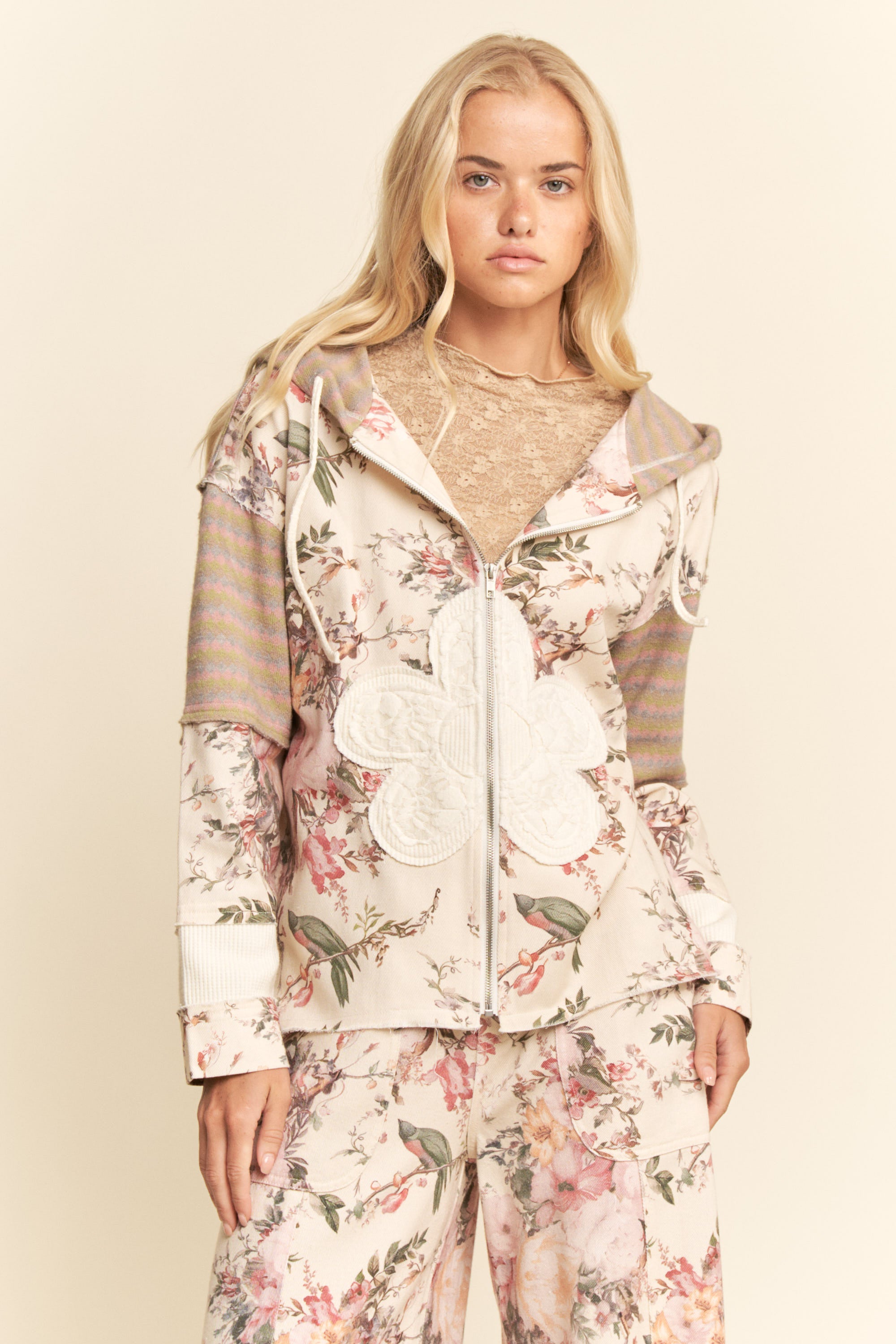 Where artisan detail meets poetic elegance—introducing the Fleur Atelier Jacket. A soft-spoken yet statement-making piece, this zip-up top blends painterly florals with textural knit stripes and an oversized appliqué flower, reminiscent of heirloom embroidery.