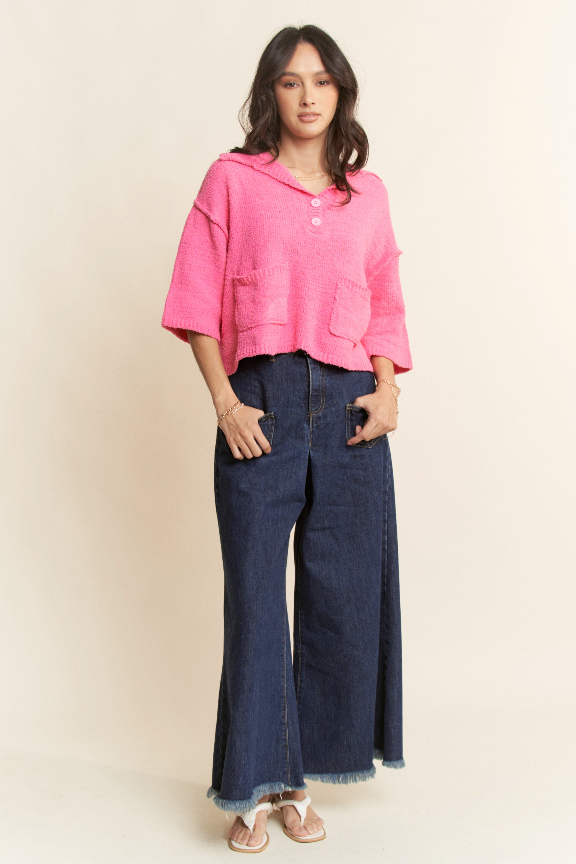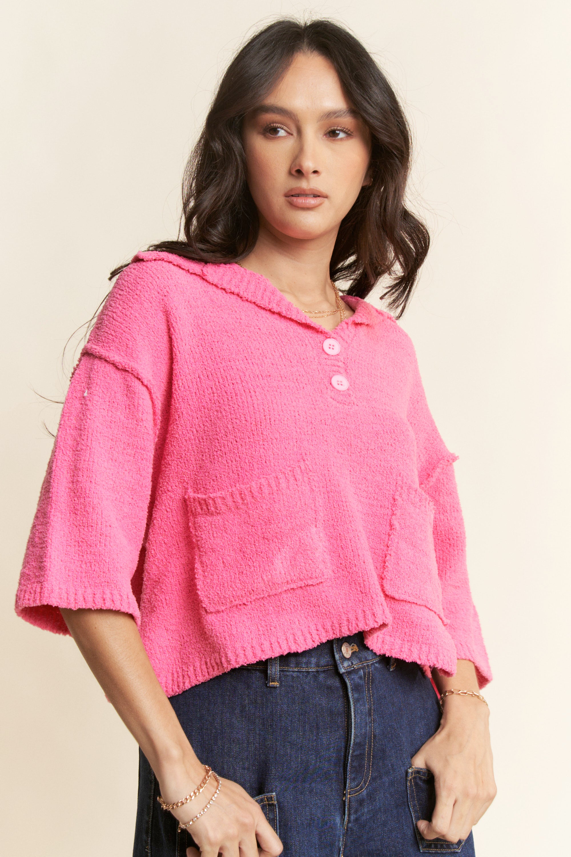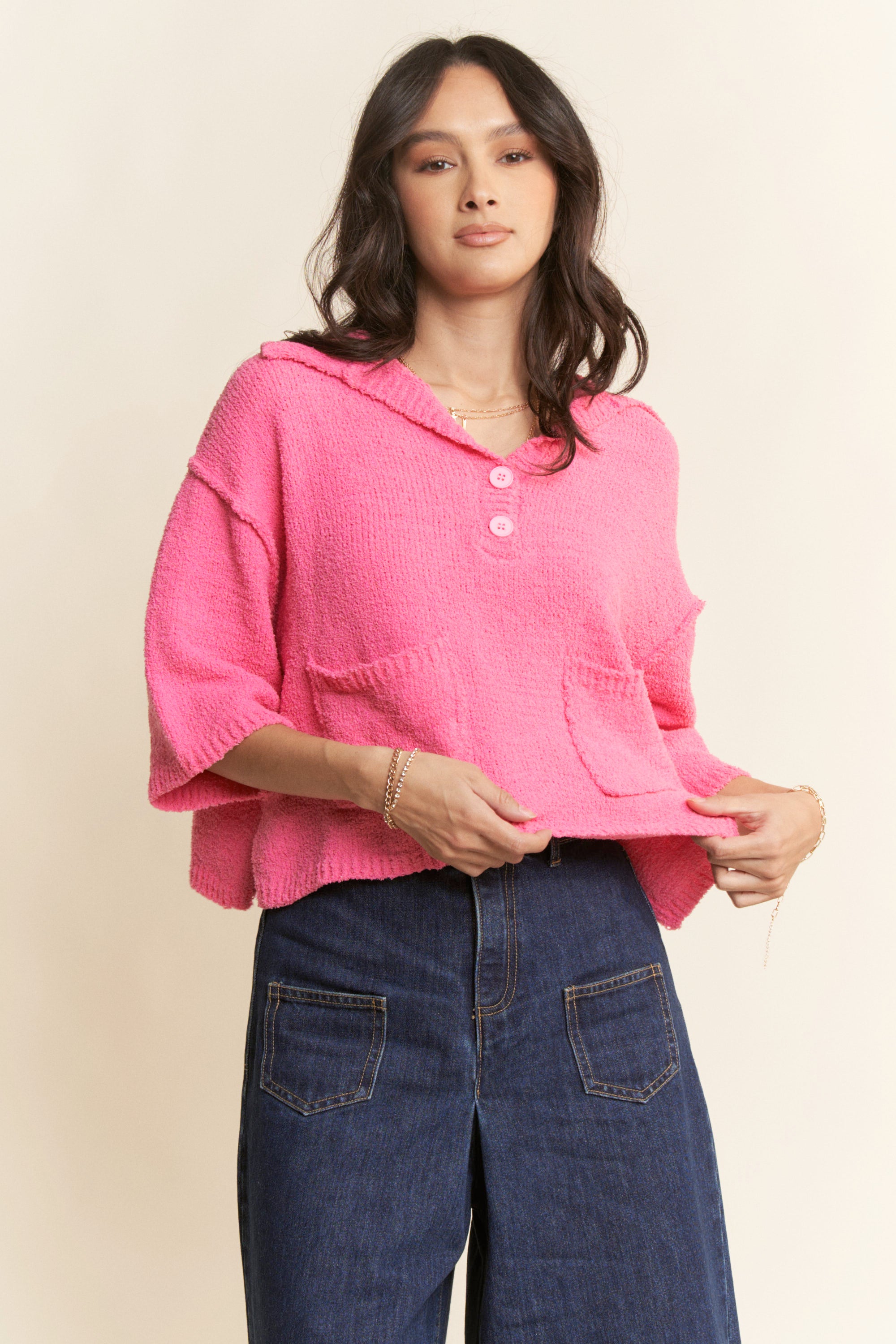 The Maison Top redefines winter layering with modern softness and sculptural volume. Crafted from a thick boucle knit in a rich pink hue, this cropped pullover brings a bold yet refined presence. With a plush texture, wide short sleeves, and a relaxed hood, it blends cold-weather comfort with editorial charm.