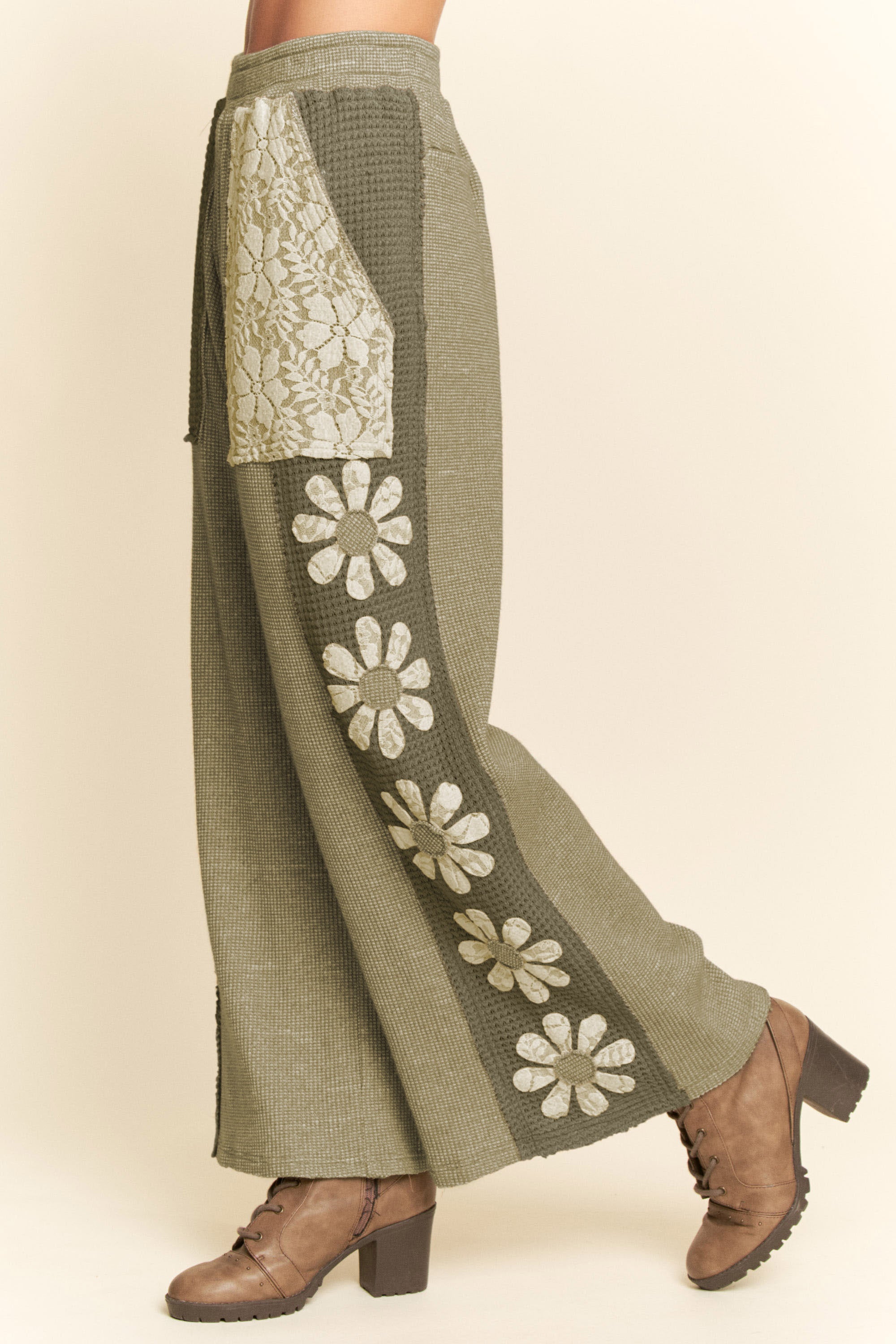 With their mixed-texture panels, floral appliqué accents, and easy drawstring waist, they’re made to move with you, pairing perfectly with simple knits, relaxed tops, or the matching piece for a look that feels effortless, creative, and distinctly boutique.