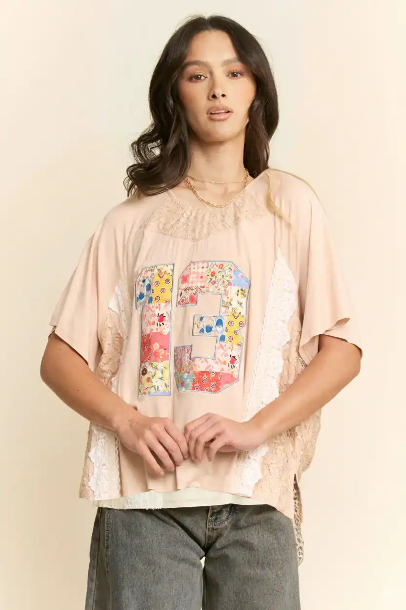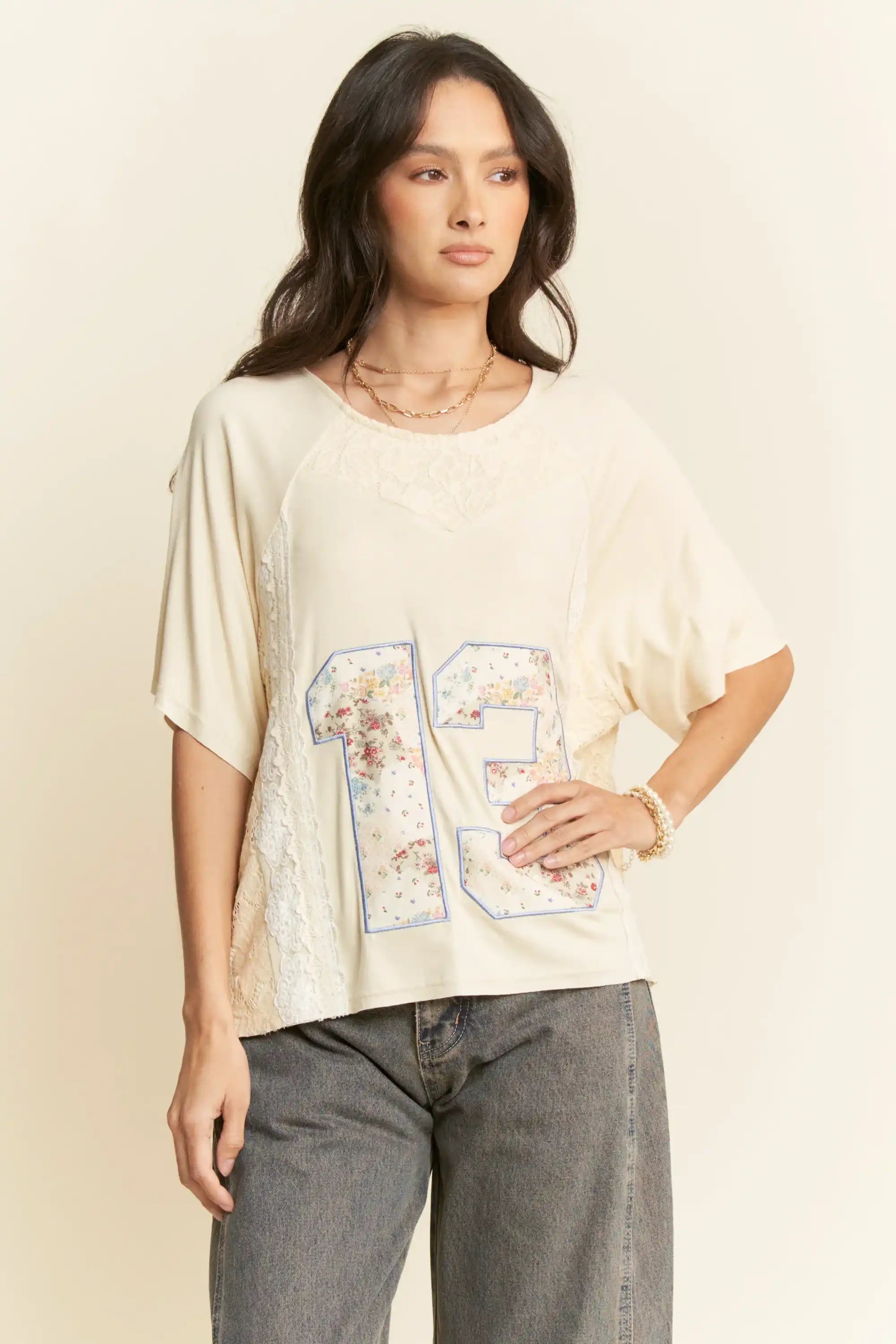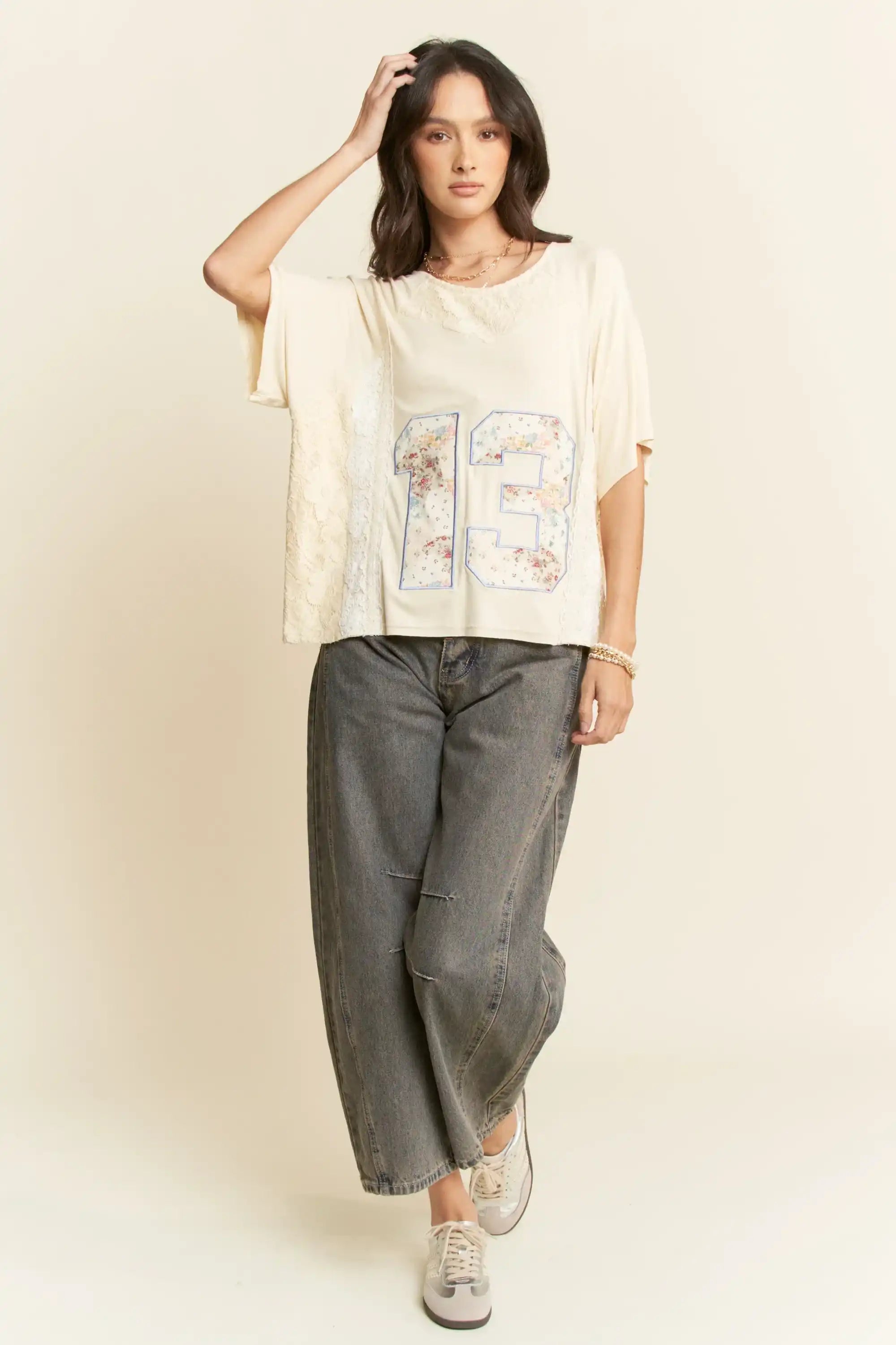 The Serelle Tee plays with contrast through soft textures and bold patchwork. Featuring a colorful “13” appliqué in mixed vintage prints, delicate lace trim, and a relaxed raglan-sleeve silhouette, this tee blends athletic inspiration with feminine charm — an easy standout in your casual rotation.