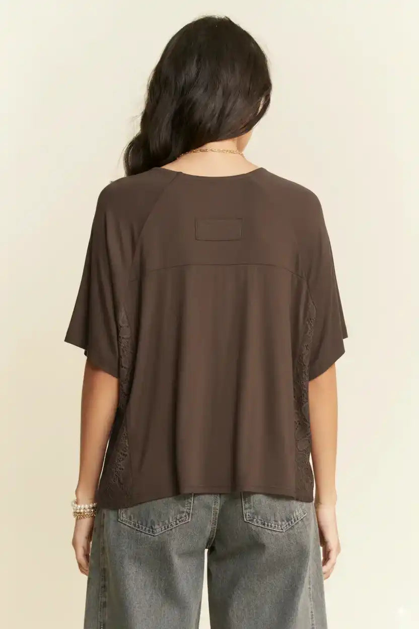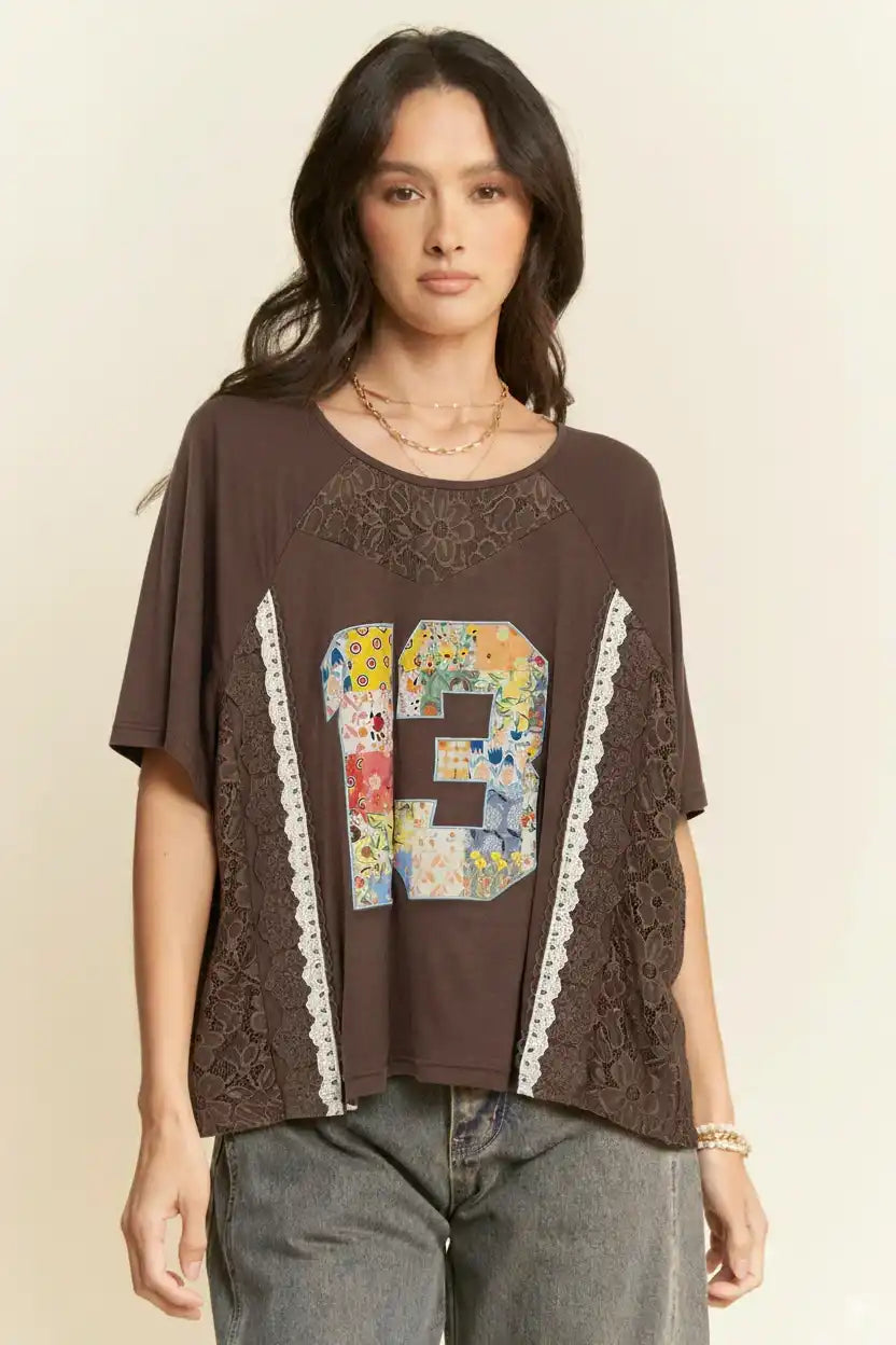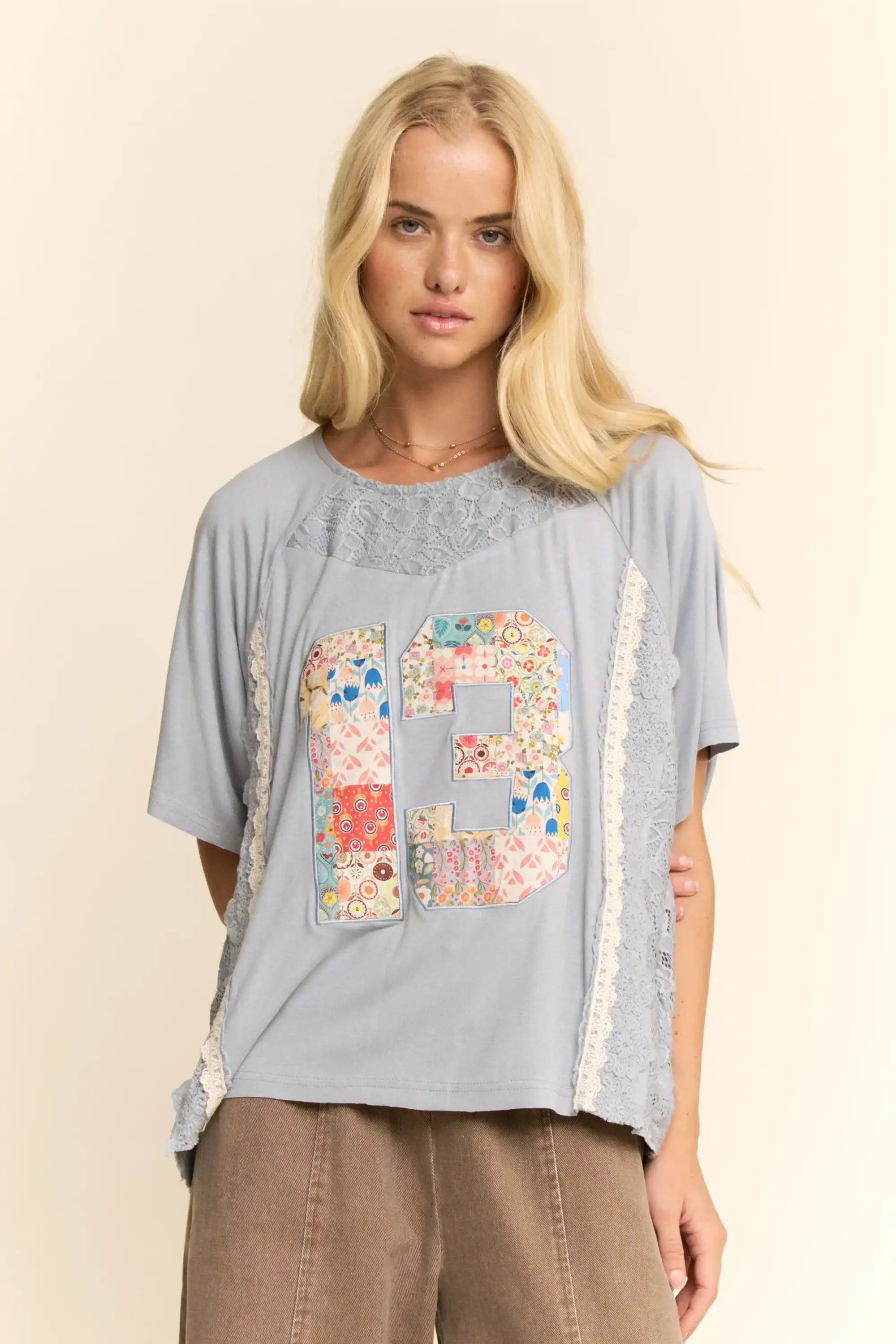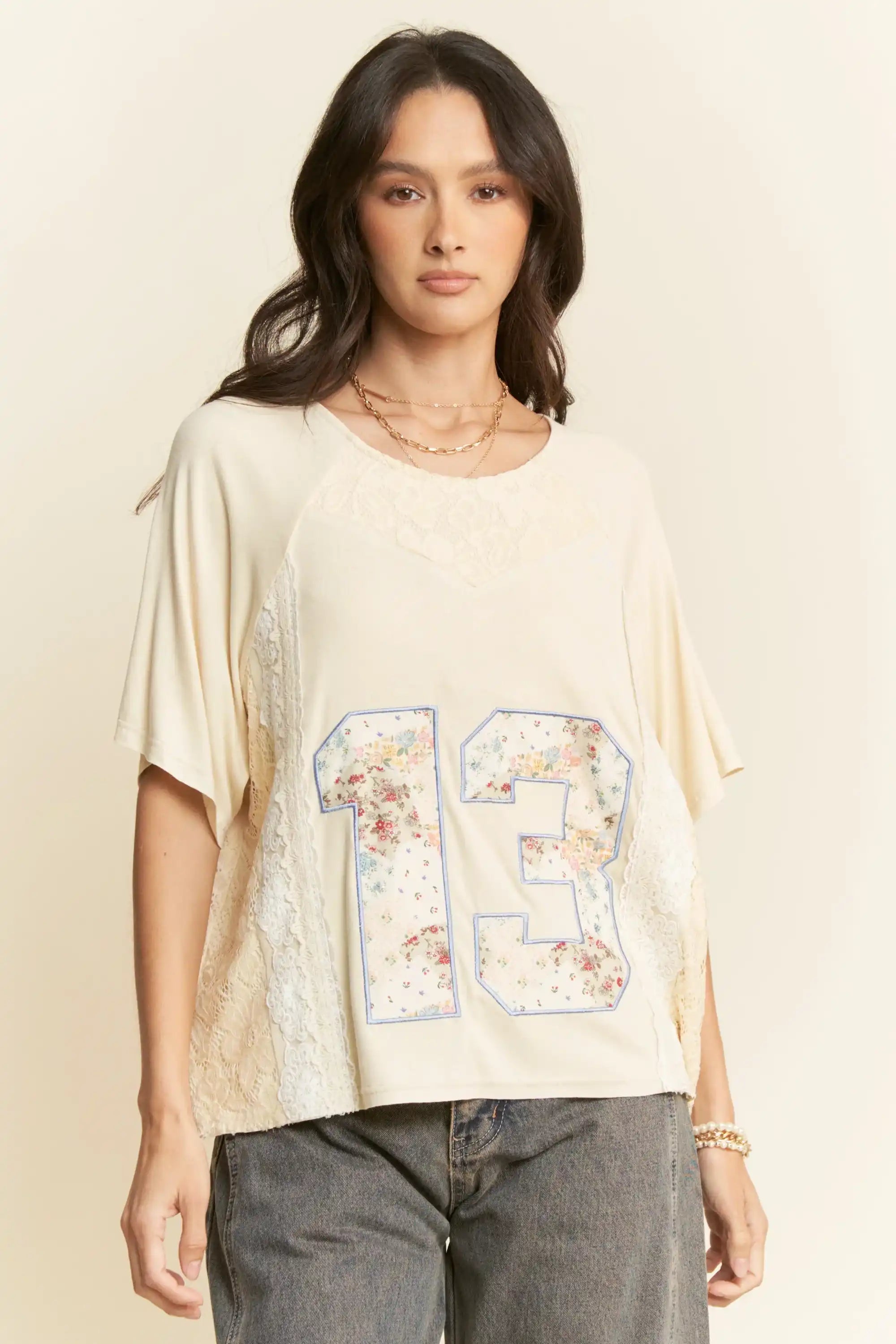The Serelle Tee plays with contrast through soft textures and bold patchwork. Featuring a colorful “13” appliqué in mixed vintage prints, delicate lace trim, and a relaxed raglan-sleeve silhouette, this tee blends athletic inspiration with feminine charm — an easy standout in your casual rotation.