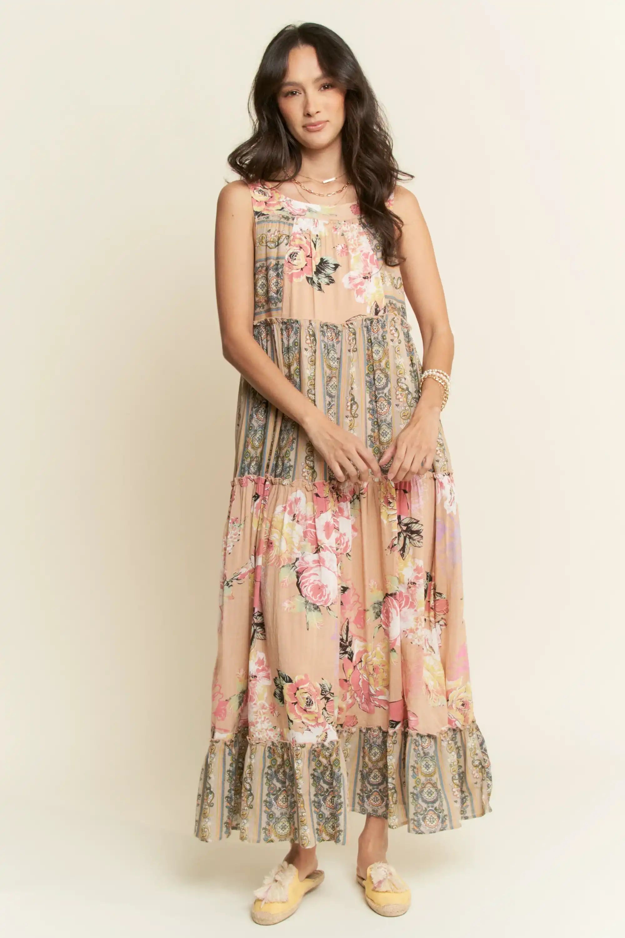 This Sleeveless Tiered Floral Maxi Dress blends romantic floral prints with vintage paisley-inspired trims in a soft, flowing silhouette. Designed...